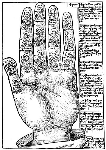 На двенадцати фалангах пальцев изображены подобия апостолов, каждый из которых несет свой соответствующий символ. В случае тех, кто принял мученическую смерть, символ обозначает орудие смерти. Так, символом святого Андрея является крест; святого Фомы — копье или строительный угольник; святого Иакова Младшего — дубина; святого Филиппа — крест; святого Варфоломея — большой нож или ятаган; святого Матфея — меч или копье (иногда кошелек); святого Симона — дубина или пила; святого Матфия — топор; и святого Иуды — алебарда. Апостолы, чьи символы не связаны с их мученической смертью, — это святой Петр, несущий два скрещенных ключа, один золотой, другой серебряный; святой Иаков Великий, несущий паломнический посох и раковину эскалопа; и святой Иоанн, держащий чашу, из которой яд чудесным образом вышел в виде змеи. (См. «Справочник по христианской символике» .) Изображение Христа на второй фаланге большого пальца не соответствует языческой системе отнесения первой Ипостаси Творческой Триады к этой позиции. Бог Отец должен занимать вторую фалангу, Бог Сын — первую, а Богу Святому Духу отводится основание большого пальца. — Также, согласно философской системе, Дева Мария должна занимать основание большого пальца, которое священно для луны.