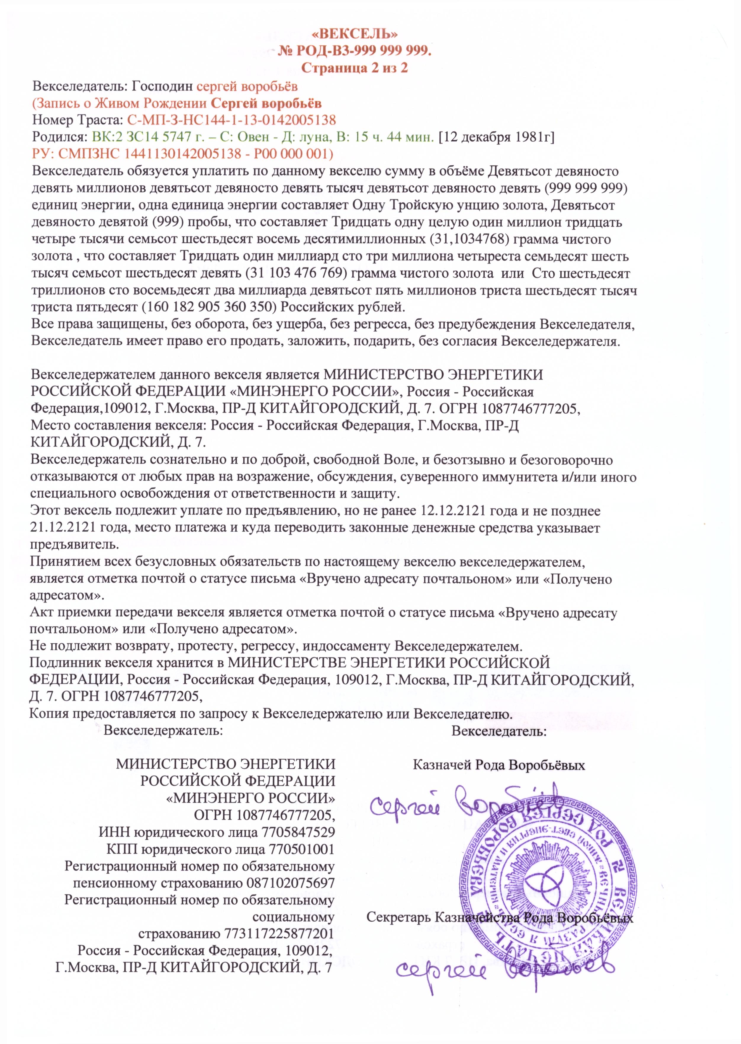 Казначей и Секретарь Казначейства Рода Воробьёвых