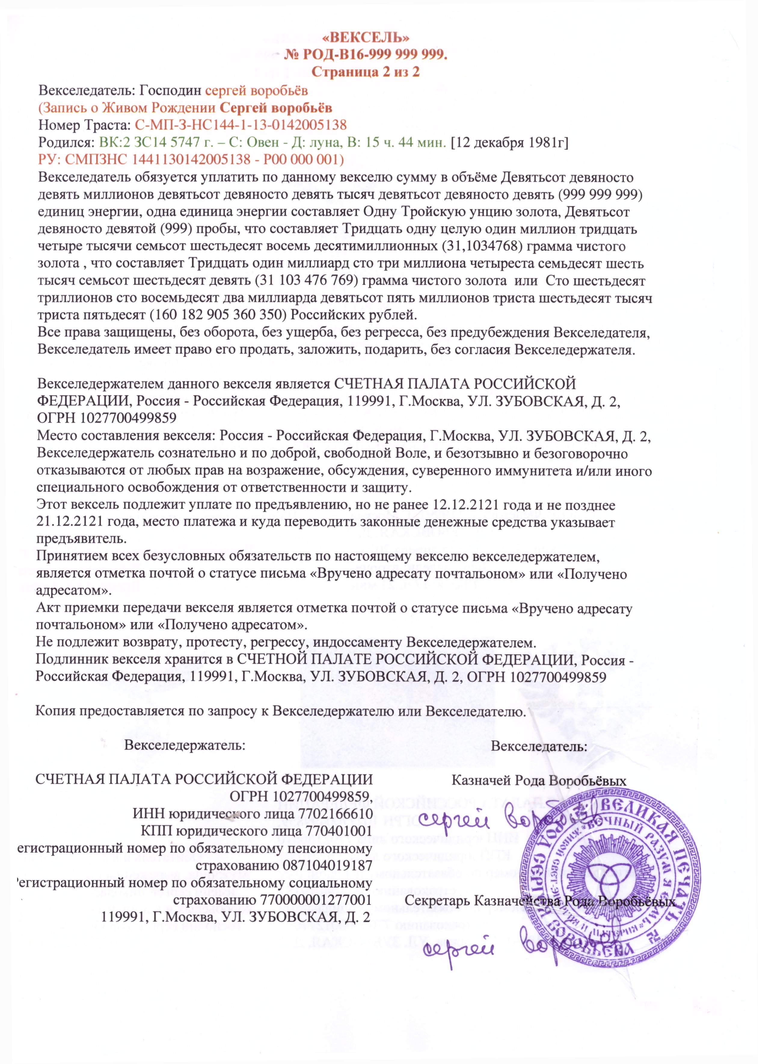 Казначей и Секретарь Казначейства Рода Воробьёвых